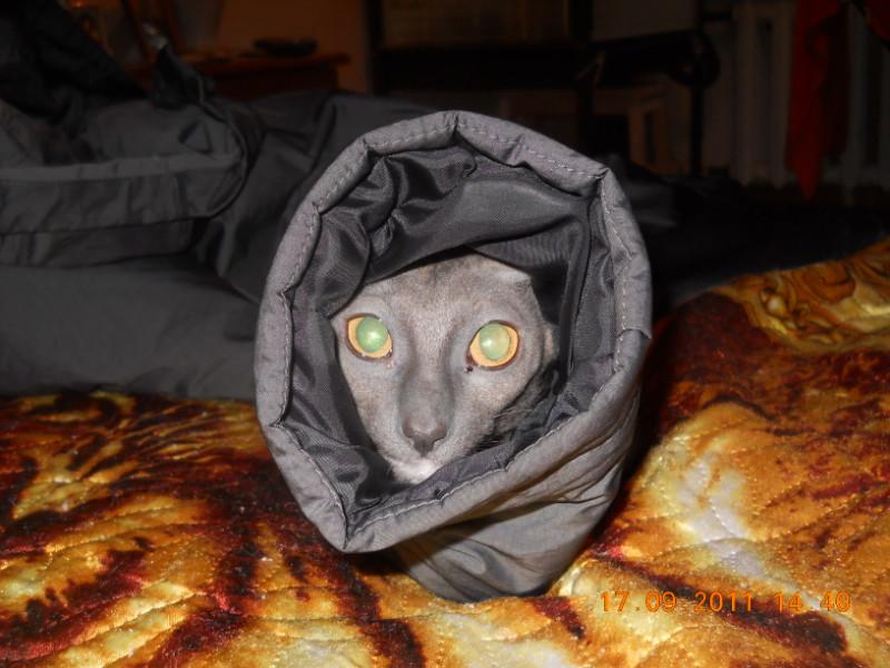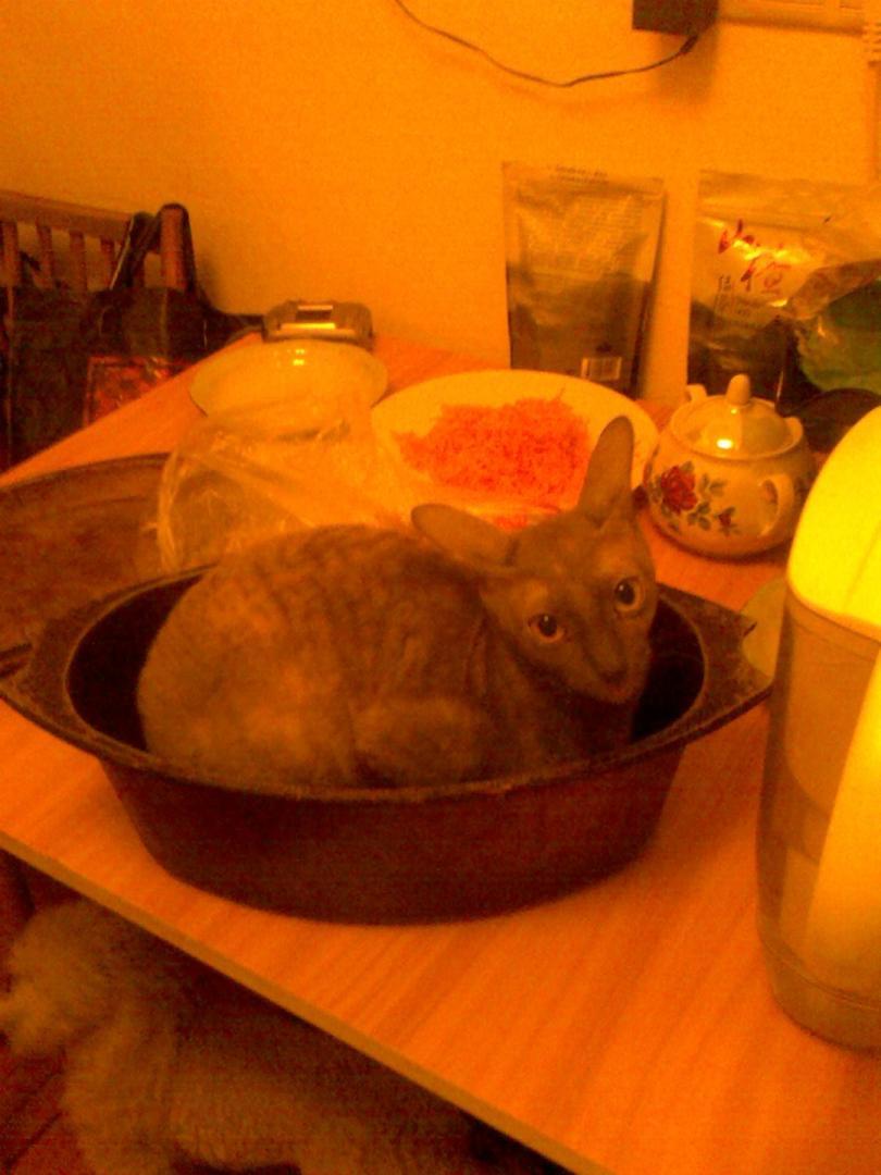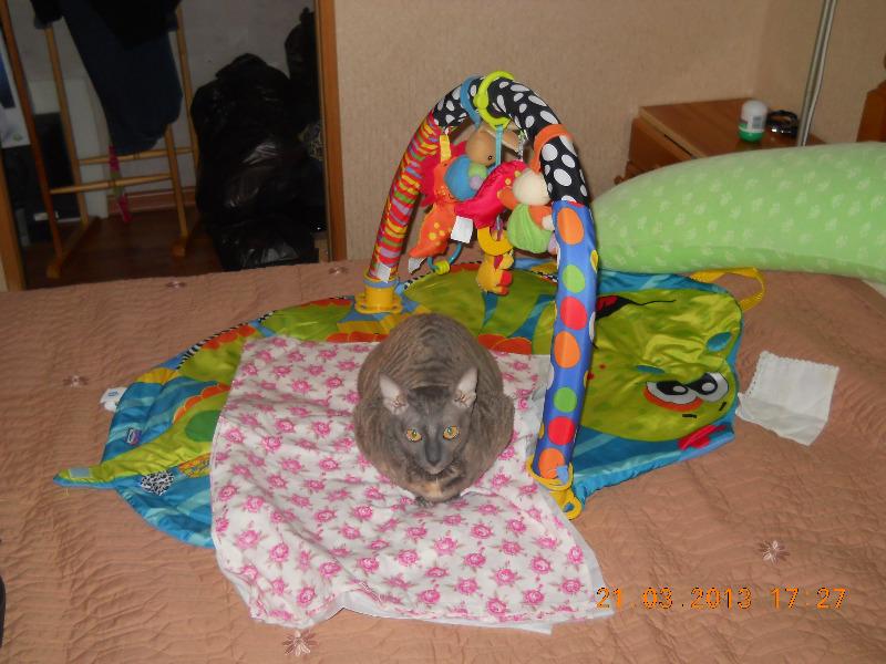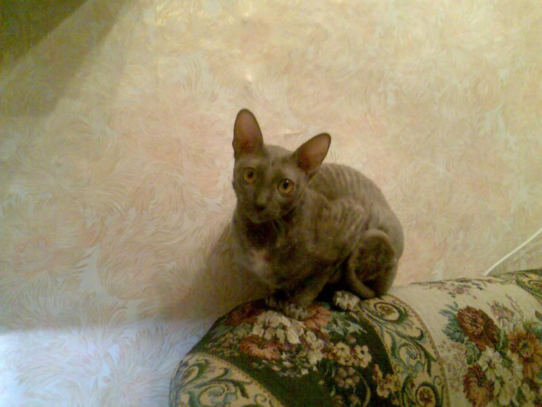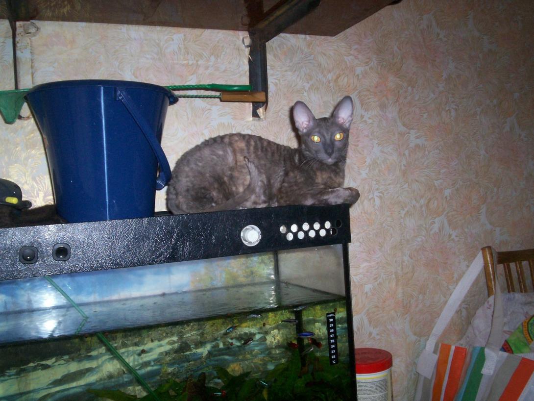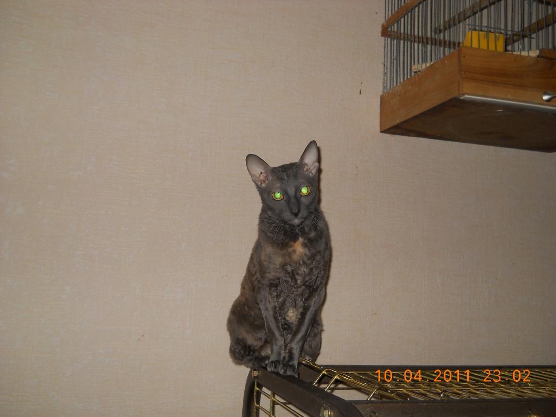 Нет, договоренности нет. Это она сама инициативу проявляет. Собакину после этих сброшенных конфет достается по полной программе, глаза приходиться лечить после сладкого. Цвет голубокремовая черепаха называется. Выглядит как серая с коричневыми и бежевыми пятнами. Да, рексы оч подвижные, интеллектуальные, добрые. Киса молоток, не злобная (нашкодит, получит под зад и не обижается), но супер-супер упрямая, любым способом добьется того чего хочет. Зайдет со всех сторон, упадет с потолка, но получит что задумала :). В тюли оч удобно повисеть, дырки остаются и виноватым в этих дырках делают большого попугая, это он когтями зацепился! Так считалось пока киса не была застигнута на месте качания :). Сбрасывает что полегче, посуду, книги не трогает, летают конфеты, таблетки, спички, карандаши и ручки, бумажки. Оч вкусные ушные палочки и косметические кружочки, в пасть запихивать одно удовольствие. У цветов в горшках листья лишние, лапой их срывает. Землю из горшков выбрасывает, сами типа виноваты, насыпали, лапа так и лезет в горшок поковыряться :)
